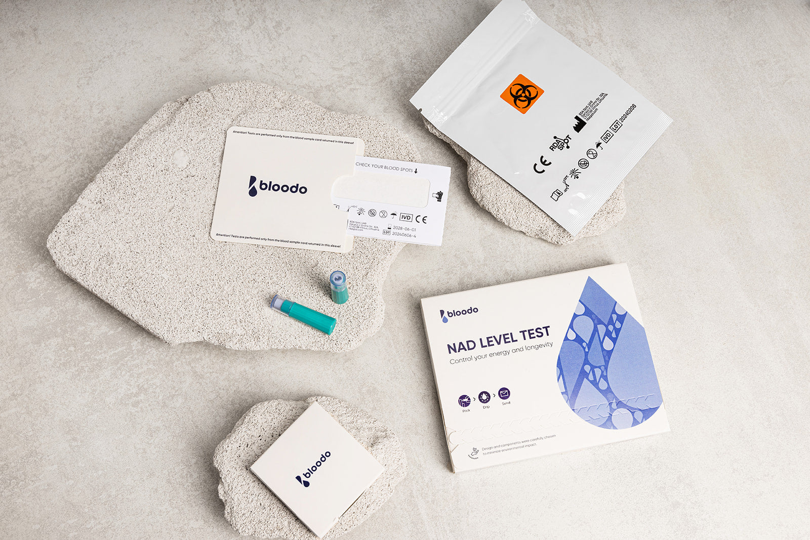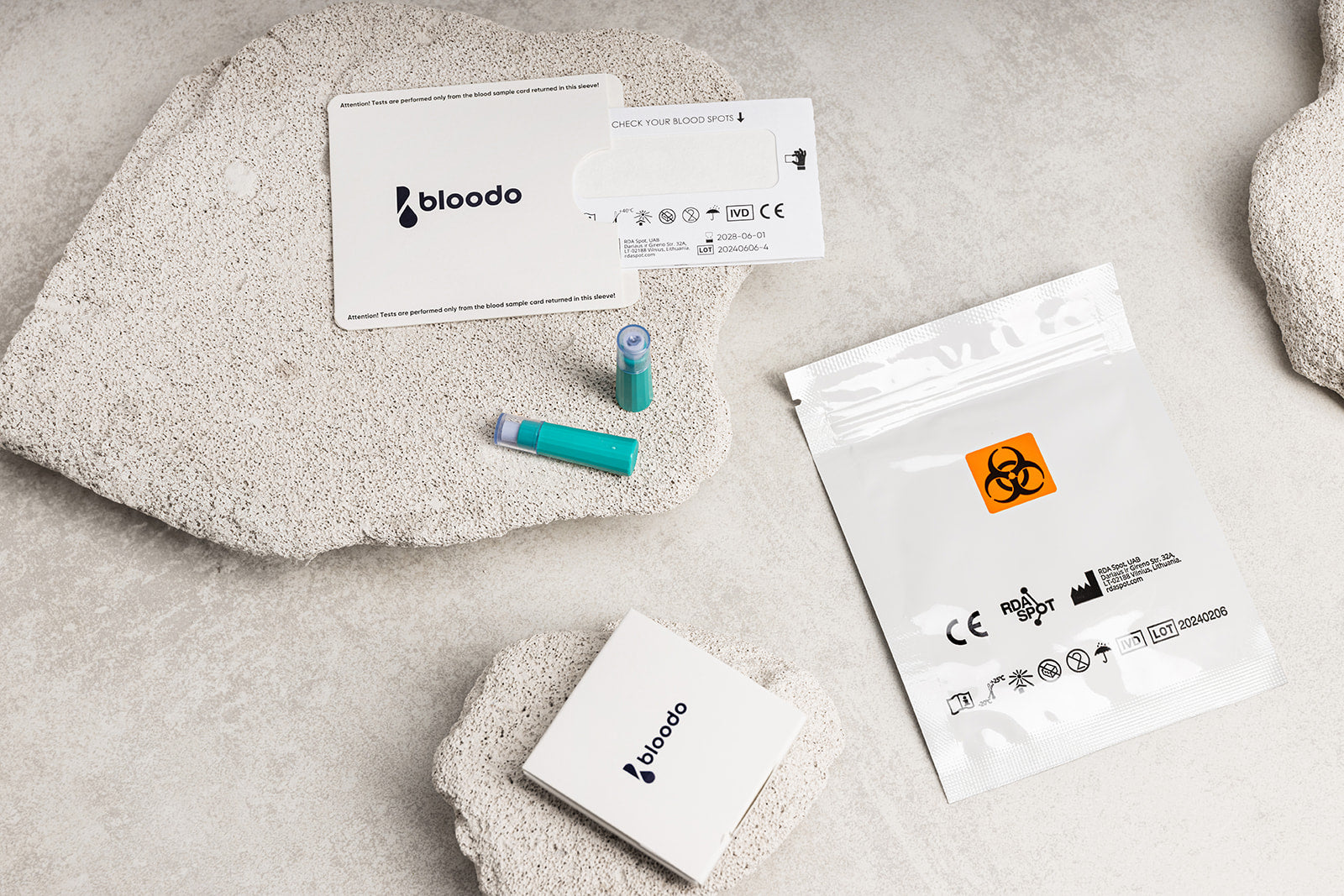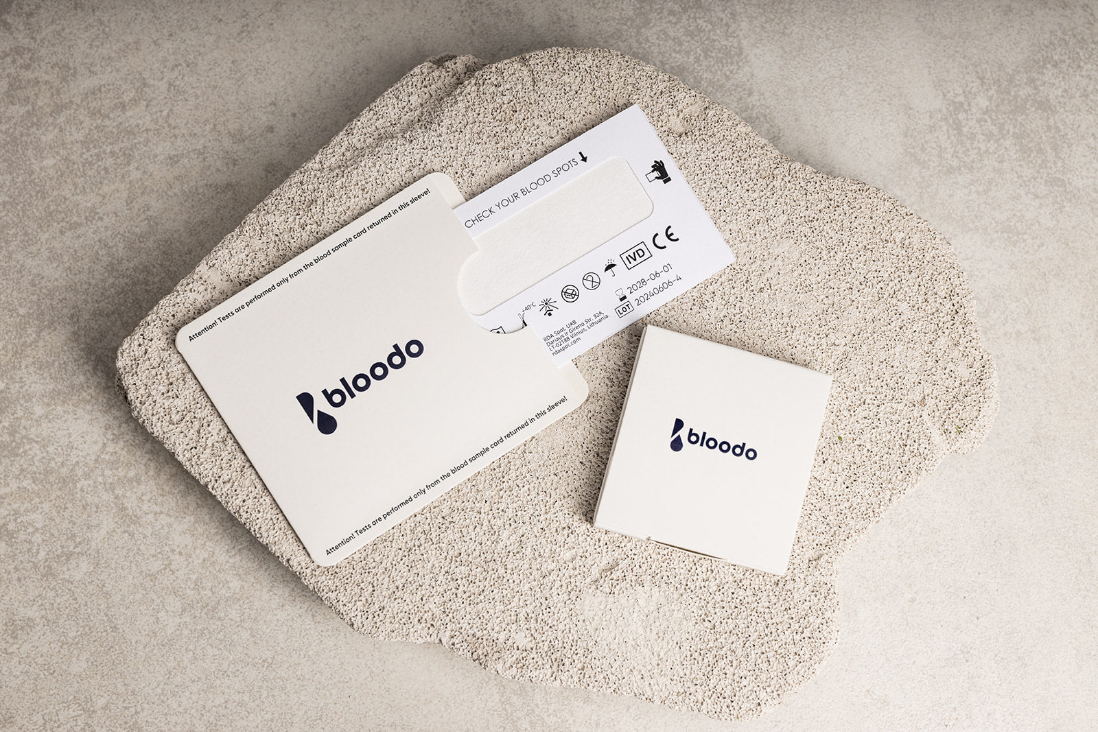 Bloodo džiovinto kraujo mėginių paėmimo rinkinys (DBS rinkinys) yra CE registruotas, tiekiamas į rinką in vitro diagnostikos medicinos prietaisas, skirtas savarankiškam kapiliarinio kraujo mėginių ėmimui, taip pat tinkamas profesionaliam naudojimui kapiliariniam ir venipunktūriniam* kraujo paėmimui. Jis gali būti lengvai naudojamas paciento kraujo mėginiams paimti tiek medicinos įstaigose, tiek namuose. DBS rinkinys skirtas vienkartiniam kraujo mėginių paėmimui iš vieno asmens. Rinkinyje yra kortelė su mėginio zona ir visais reikalingais komponentais kraujo mėginių paėmimui ir pristatymui į laboratoriją. DBS rinkinys nėra automatizuotas ir neduoda jokių momentinių rezultatų.