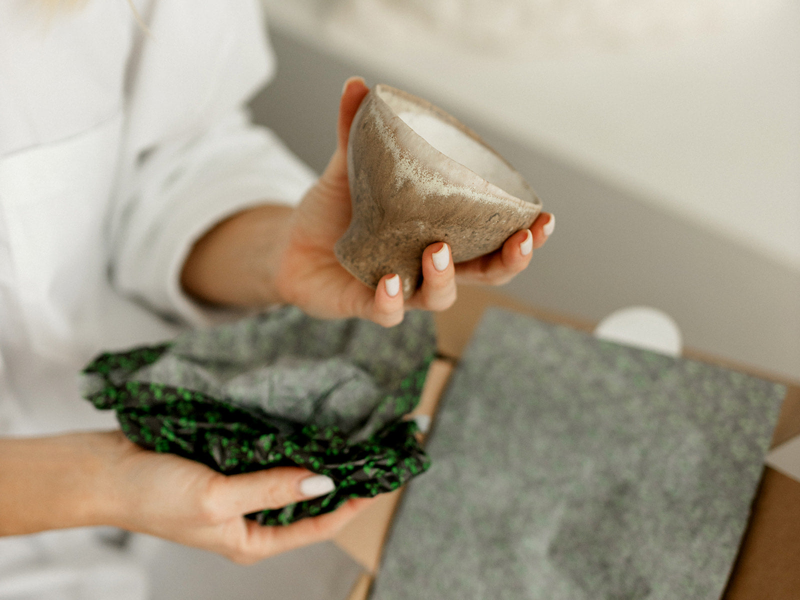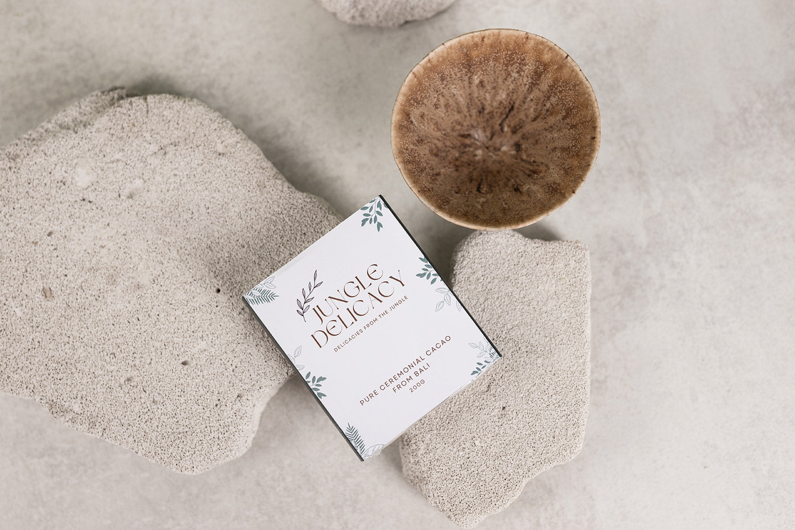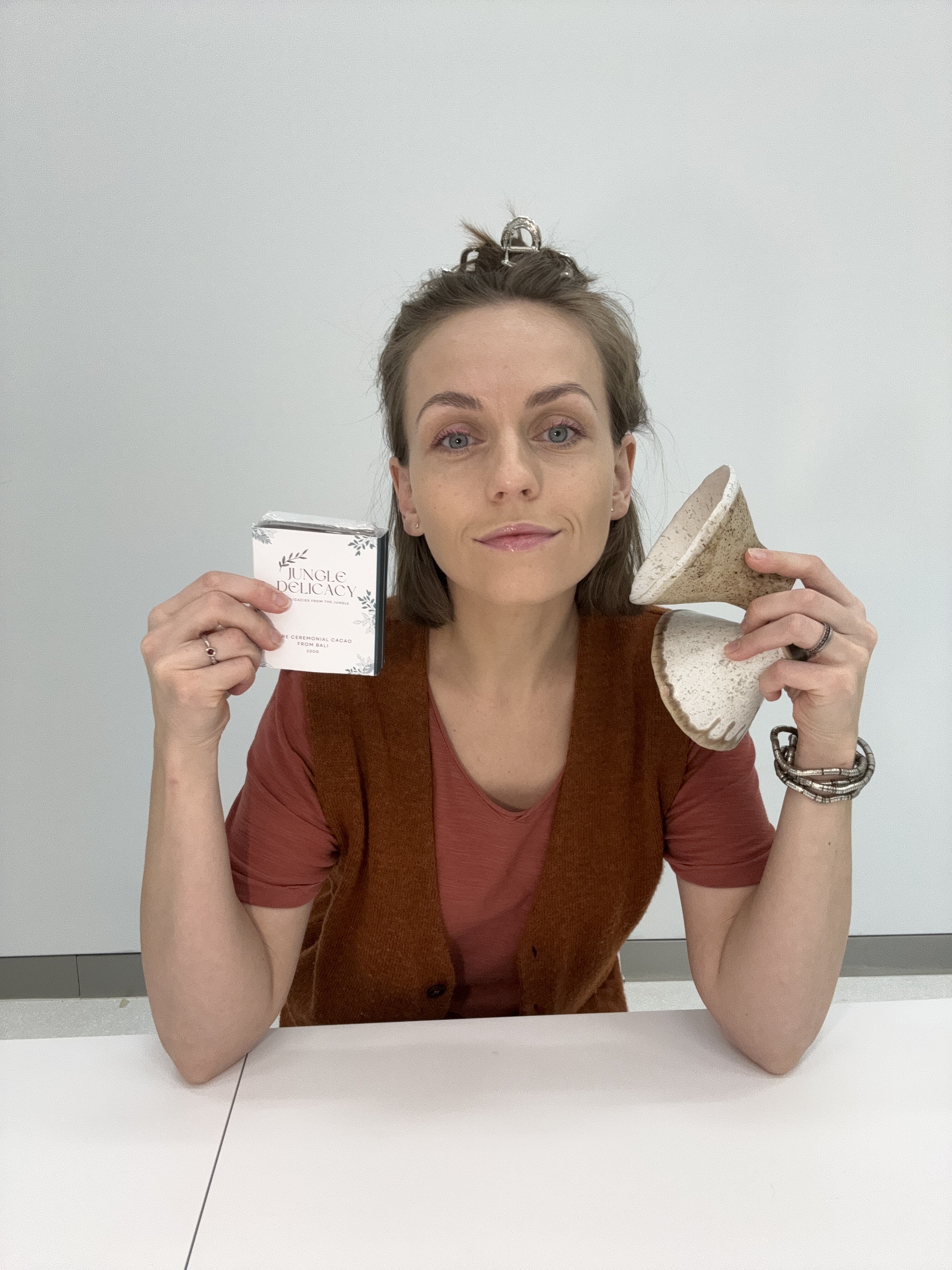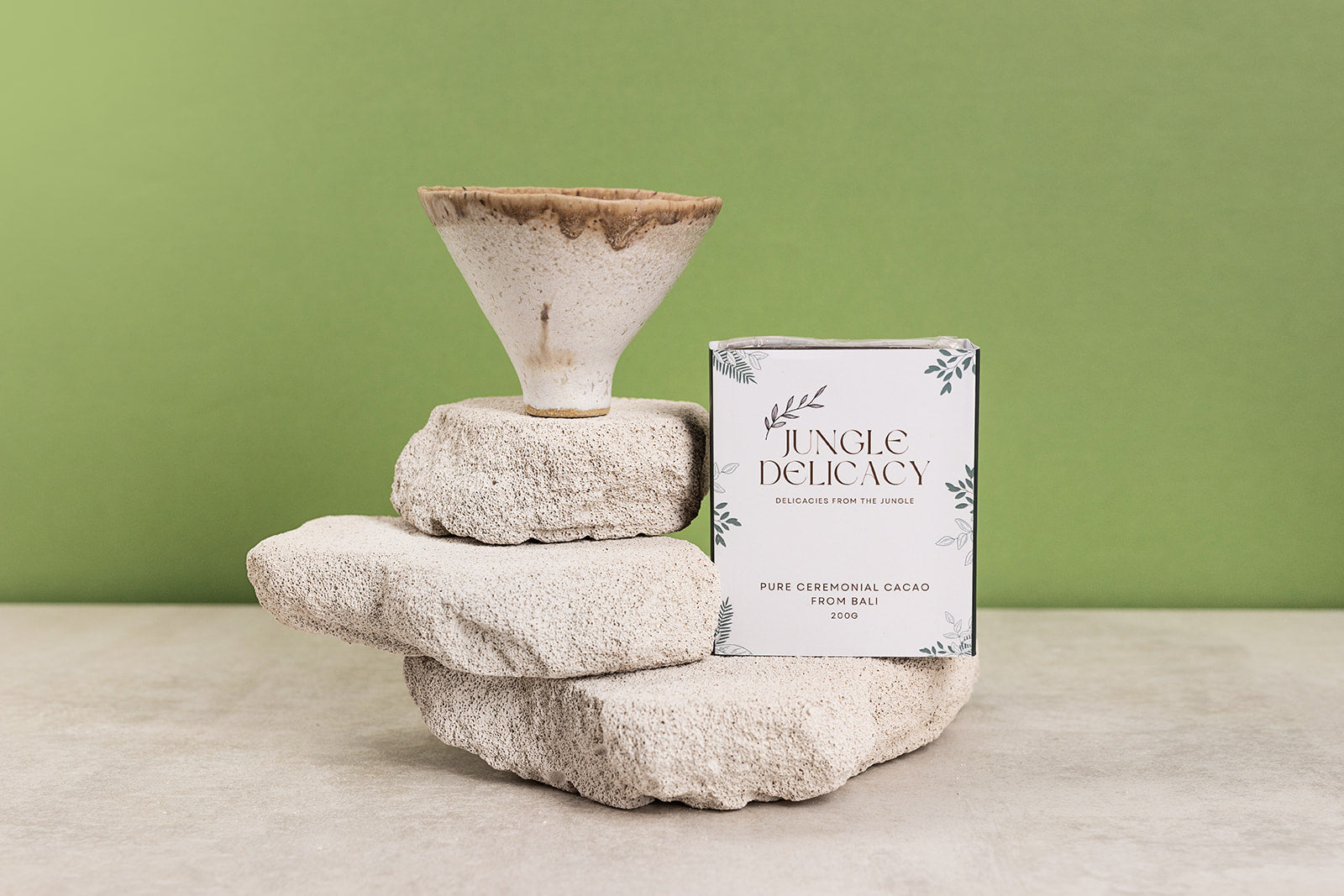 Rinkinyje 200g ceremoninės kakavos iš Bali ypatingiems vakaro ritualams ir keramikos meno kūrinys - rankų darbo puodelis.